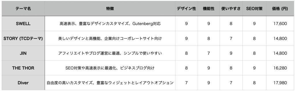| テーマ名 | 特徴 | デザイン性 | 機能性 | 使いやすさ | SEO対策 | 価格 (円) |