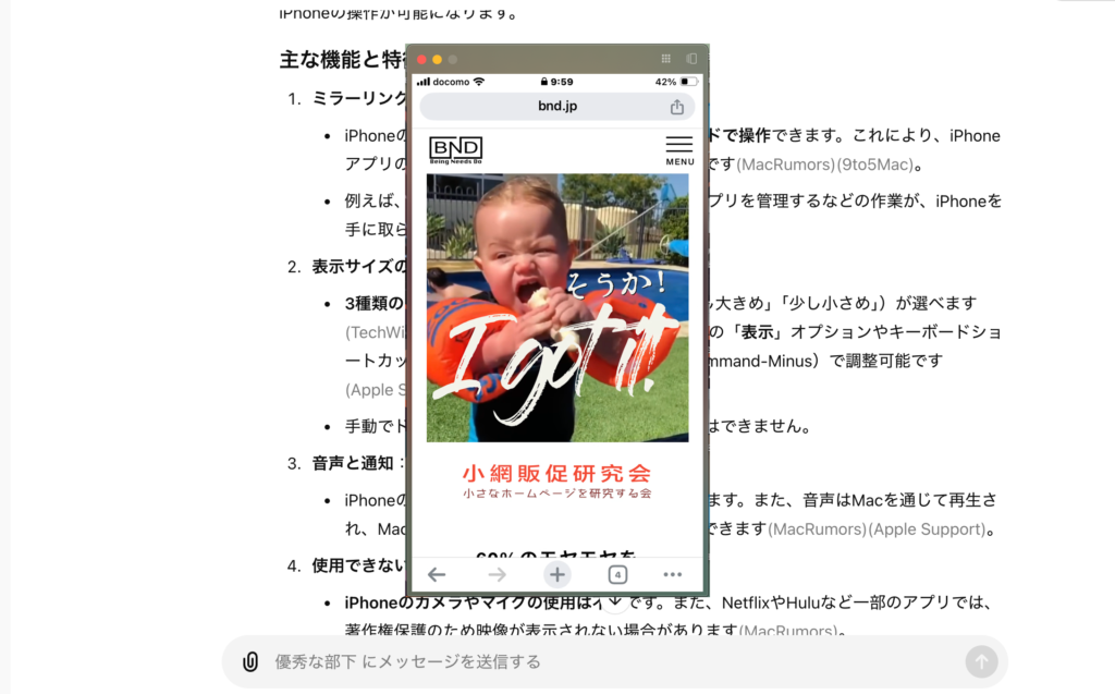 という流れでしたが、この機能を使えば、iPhoneの画面をMacにそのまま映し、直接操作しながらMac上でキャプチャやスクリーンショットを撮ることが可能です。