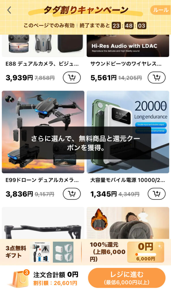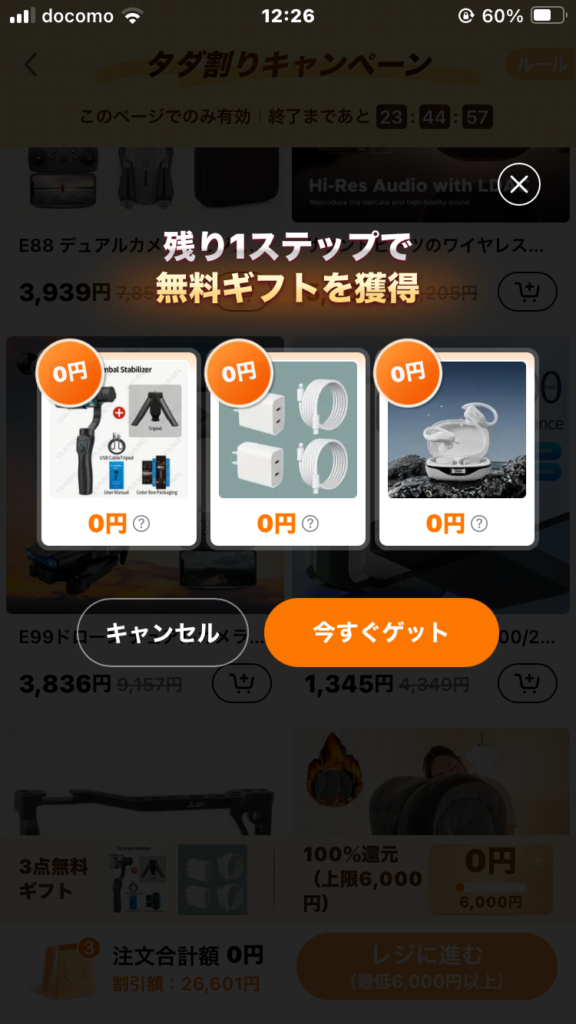 Temuの「格安の商品」に釣られ、買おうとすると「無料キャンペーン」に誘導されました。