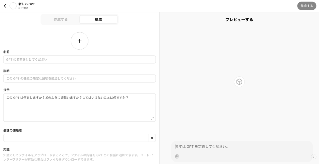 GPTのイメージに合ったタイトルを入力し、デザインにこだわりたい場合はアイコンを作成またはアップロードします。これにより、完成形が視覚的にもイメージしやすくなります。
