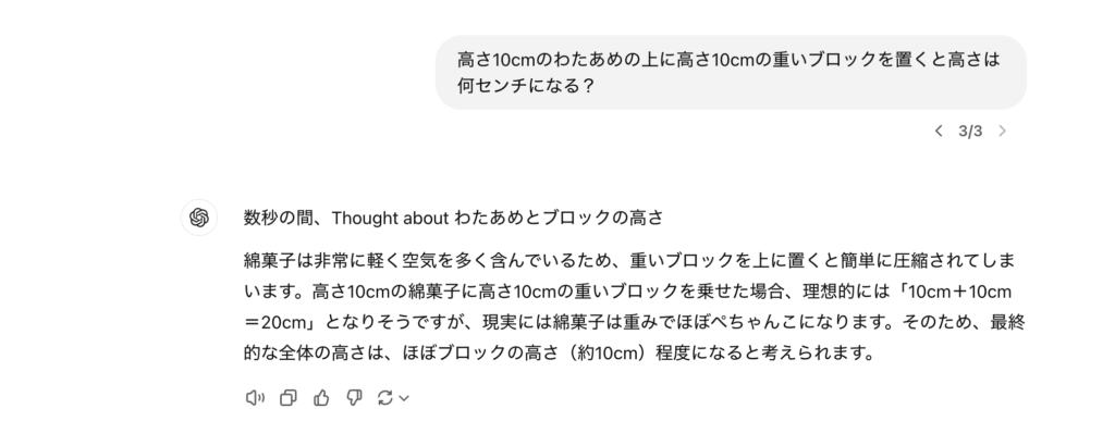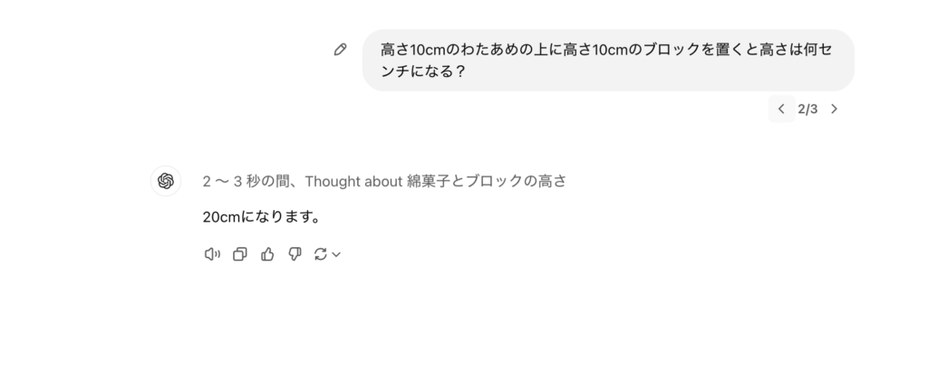 たとえば、「高さ10cmのわたあめの上に高さ10cmのブロックを置くと、全体の高さは何cm?」という問いに答えることができます。