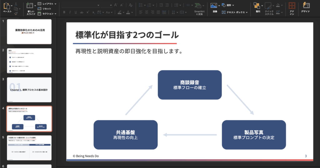 これは、通常想定されるPPT変換時のトラブル(フォント、図形、レイアウトの互換問題)が回避されたことは大きいとおもっています。ManusやGensparkでもよくあるトラブルがこちらではない。