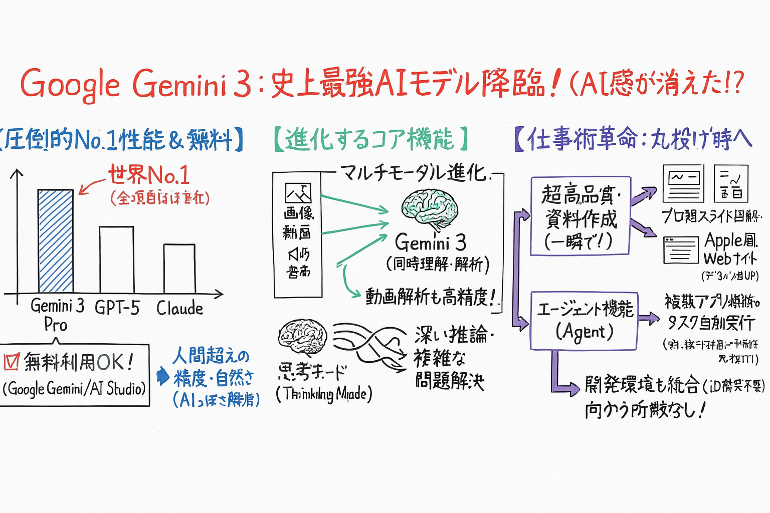 AIには少し難しいと思われていた「グラフィックレコーディング(グラレコ)」。中田敦彦のホワイトボードのようなまとめもGemini 3.0 proだとできそうです。