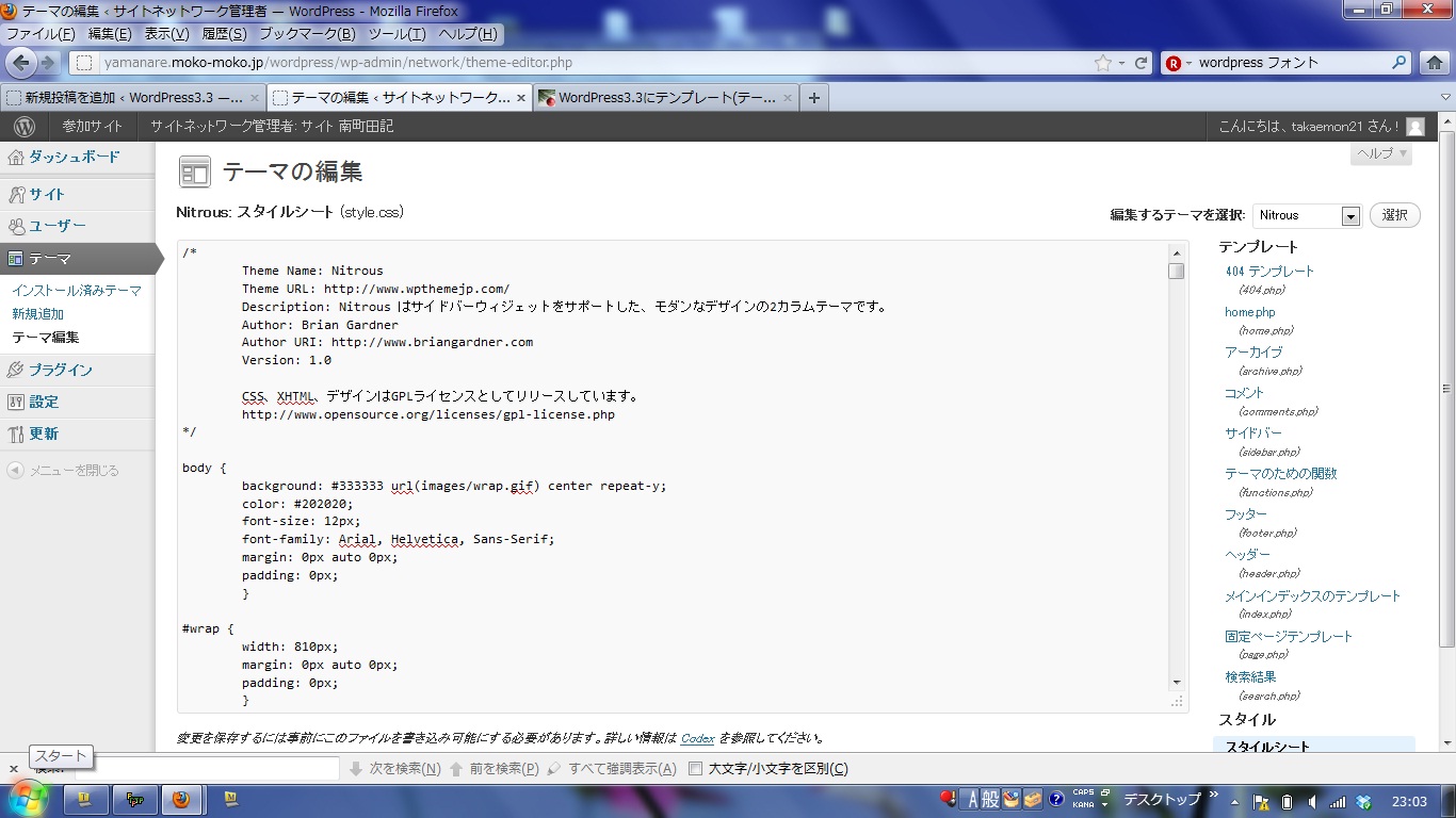 出てきた「テーマの編集」画面の右サイドにある「テンプレート」のずらりと並んだファイルの中から、「style.css」を見つけてクリックします。