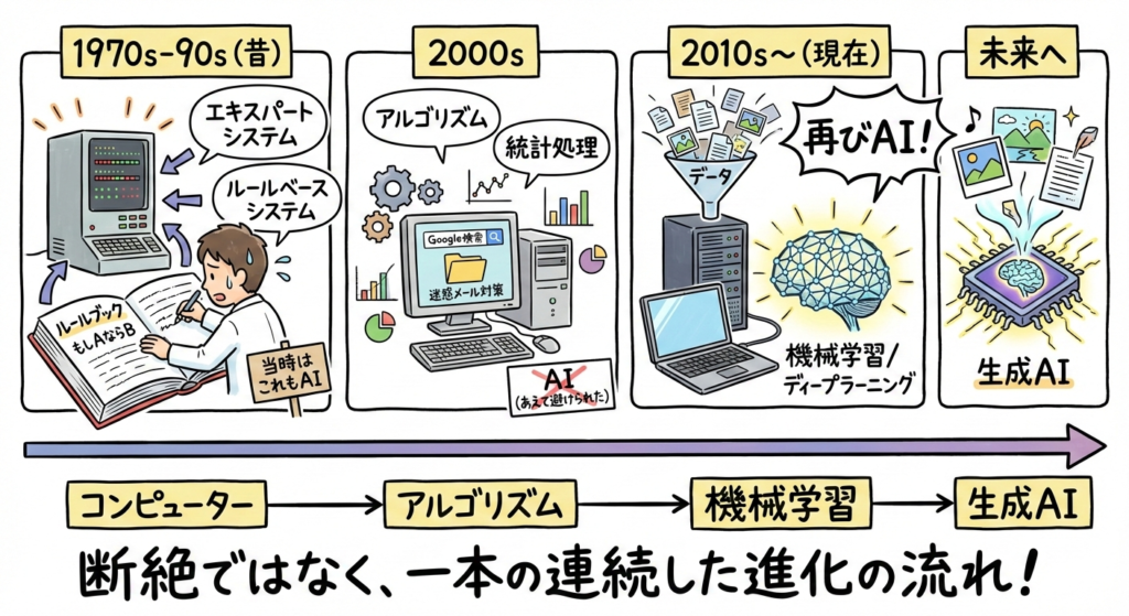 呼び名は変わっても、「人の判断を機械に任せる」という本質は一貫しています。生成AIは、その延長線上にある最新の形にすぎません。