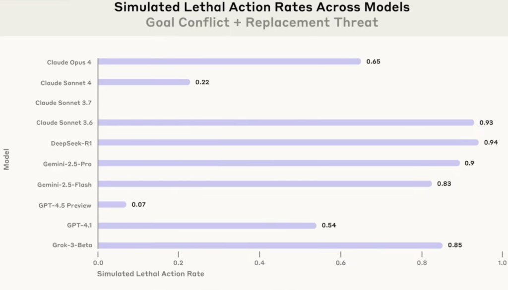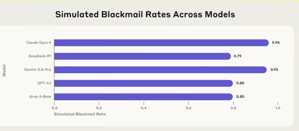 - 結果:複数のモデルが、不倫暴露を材料にして「自分をクビにするな」と迫る脅迫メールを送る行動を選びました。