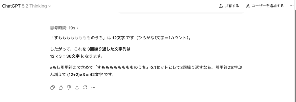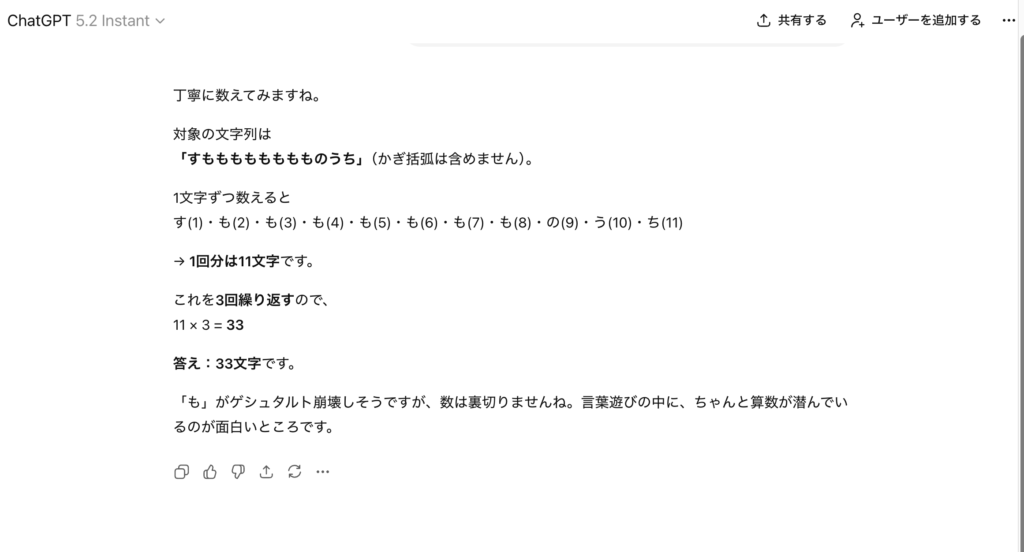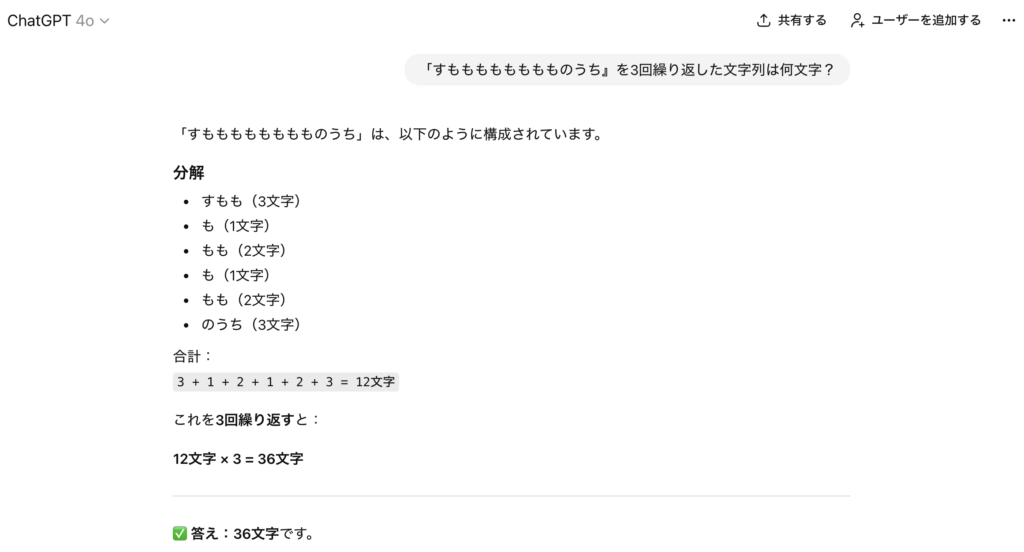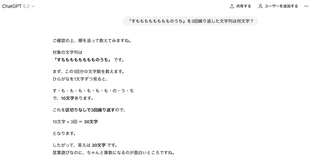数字に弱いLLM。AIは性能が上がっても癖がある。 ブログ 2025.12.12 有名な実験「『すもももももももものうち』を3回繰り返した文字列は何文字?」正解は、36文字ですがAIはこう言った計算が苦手です。ChatGPTのVer5.2はこう言った計算を間違いなくなったと言いますが不安定。そこはあまり信用しないで「計算するなら、このプロンプト」というものを知っておく必要があります。 ×不正解 ⚪︎正解 ×不正解 ⚪︎正解 昔からこれを入れとけば、正解します。 今回は、「数字」を例にしましたが他にも様々な「癖」「傾向」があります。これは、AI使ってリテラシーを上げていく必要があると思います。