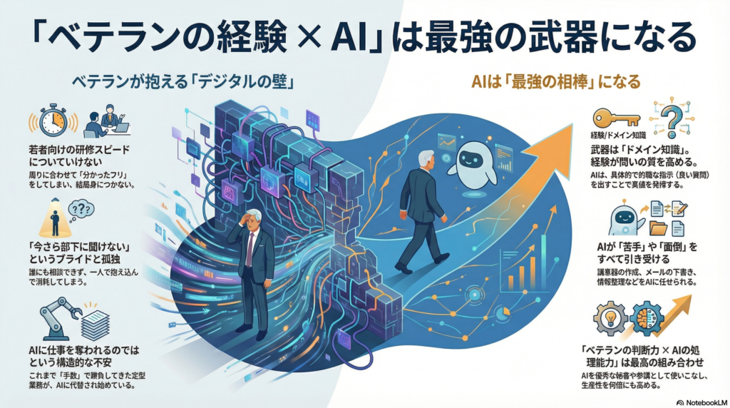 ベテラン管理職の経験は、AIによって陳腐化するどころか、むしろ増幅させることができます。必要なのは不安に耐えることではなく、経験を武器として再設計することですね。