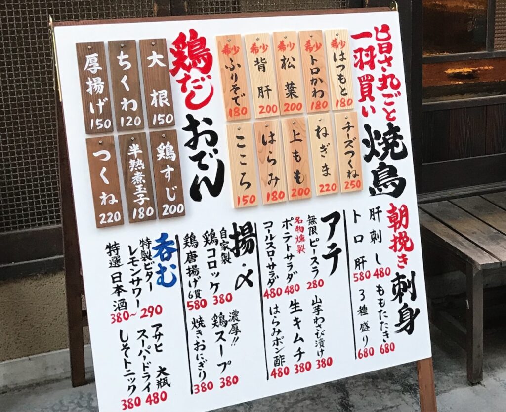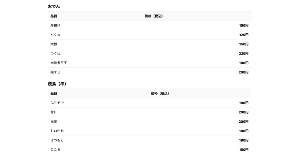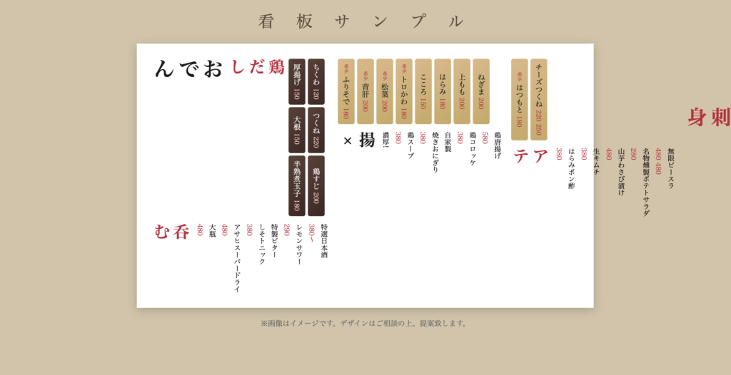 居酒屋のメニュー看板(画像)を読み込ませ、ウェブサイトを一発生成させる比較実験を行った。