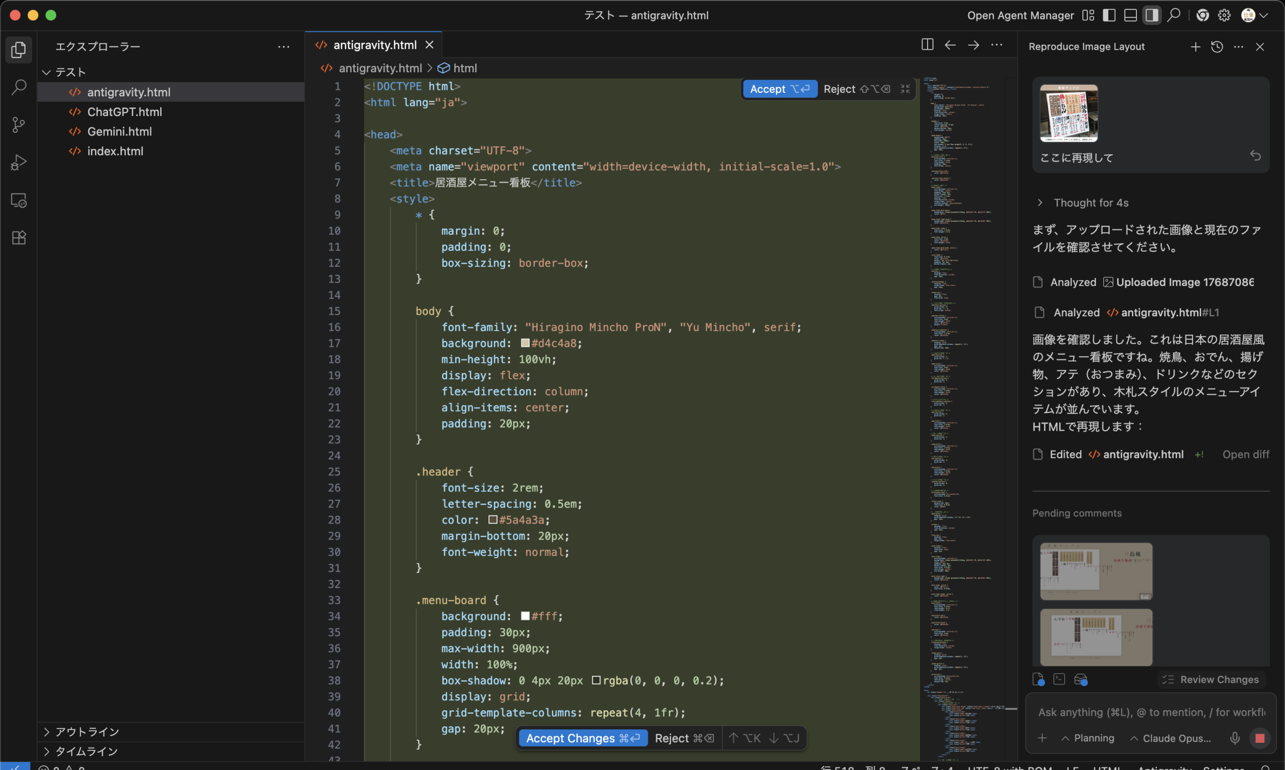 居酒屋メニュー画像からサイトを作らせるという文脈では、段突なのはAntigravity、という結論である。