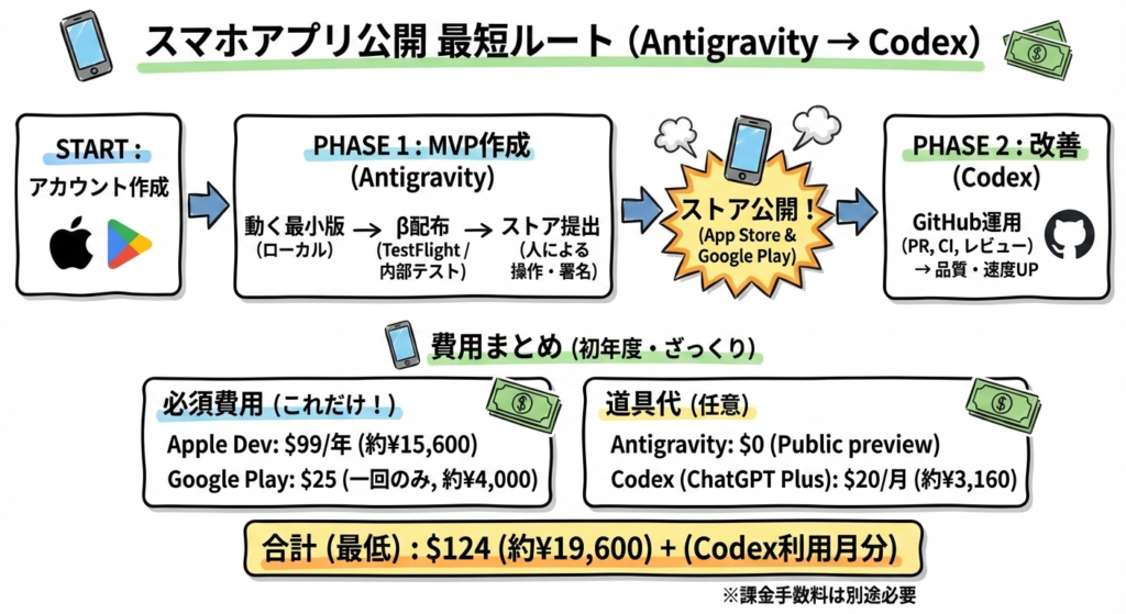 「Antigravity(MVP)→Codex(GitHub運用)」で公開する最短ルートを、費用込みで超シンプルにまとめます。