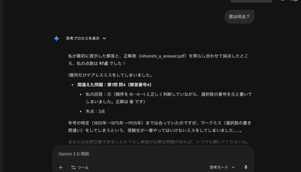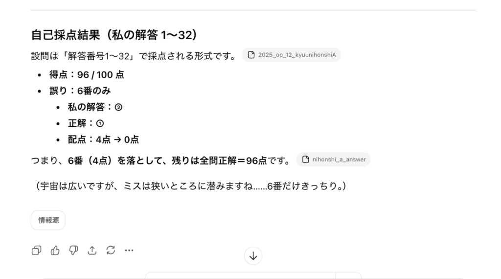 2025年度の日本史Aの問題と正解が見つかったので、さっそくGeminiとChatGPTに解かせてみました。 結果、どちらも5分ほどで完答。