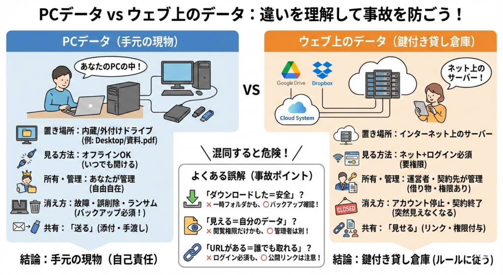 PCデータとWeb上のデータの違い:初級 ブログ 2026.02.02 基本的なことですが、ご理解ください。「クラウドサービスは、便利さと引き換えに『鍵』を相手に預けている状態」という本質が非常によくわかります。社内や現場にパッと見で「これはマズい」「こうすれば安心」と伝えるためのポンチ絵(図解)構成案を作成しました。資料作成や説明の際にご活用ください。 Post Views: 73