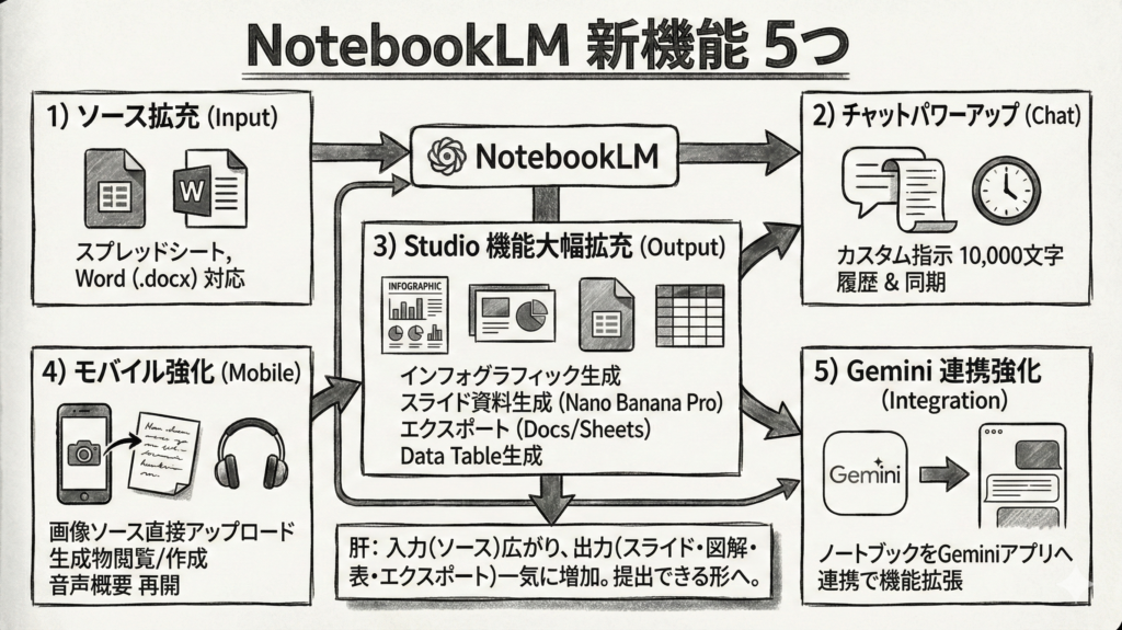 NotebookLMの「新しく追加された機能」に絞って、要点だけ整理。