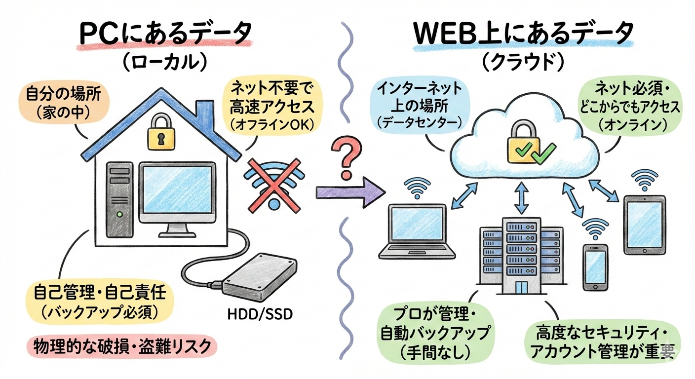 クラウド型のSaaSは、どこからでも開けて共有もしやすく、検索も速い。けれど安心の根拠をデータの保管先に置きすぎると危険です。多くの場合、手元にあるのはデータそのものではなく、ログインして使うためのアクセス権です。鍵は持っているのに、ある日突然ログインできなくなると、仕事は止まります。家で言えば鍵穴ごと消えるようなものです。