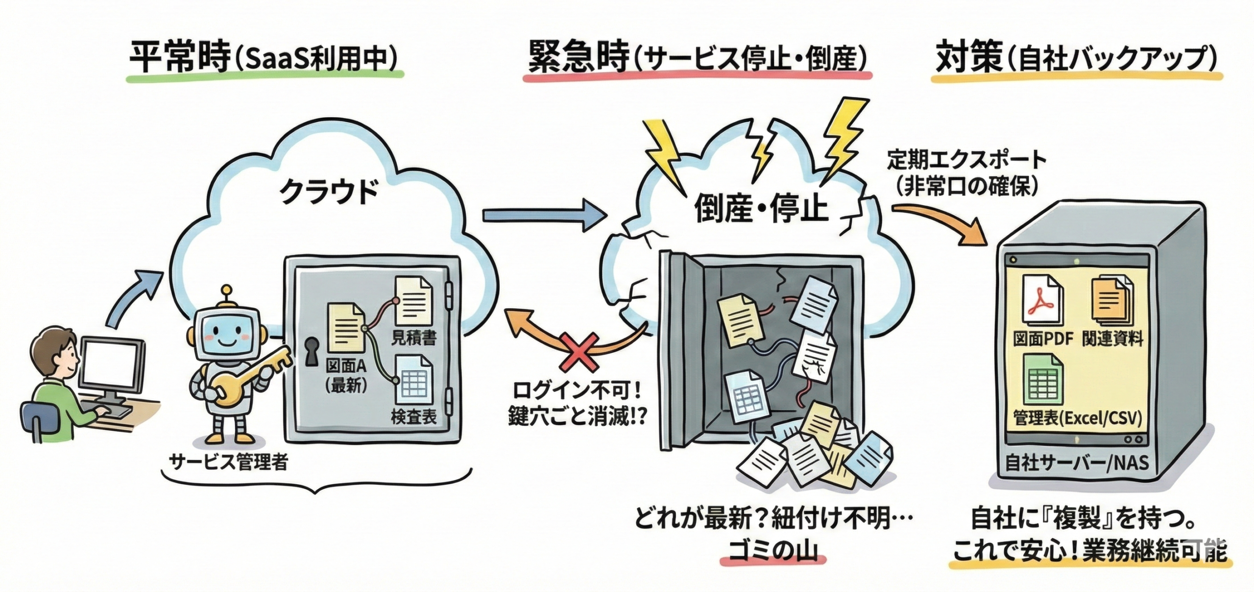 怖いのは倒産だけではありません。サービス終了、プラン変更などの契約トラブル、運用ミスによる停止、障害の長期化、サポート縮小。共通する事故はログインできないことです。さらに厄介なのは、ファイルが取れないだけでなく、最新版の判断や、図面と見積、工程、検査といった紐付けが崩れ、検索もできず、担当が替わると復旧が難しくなる点です。台帳としてのCSVが出ても、中身の実ファイルと対応関係がなければ業務は戻りません。