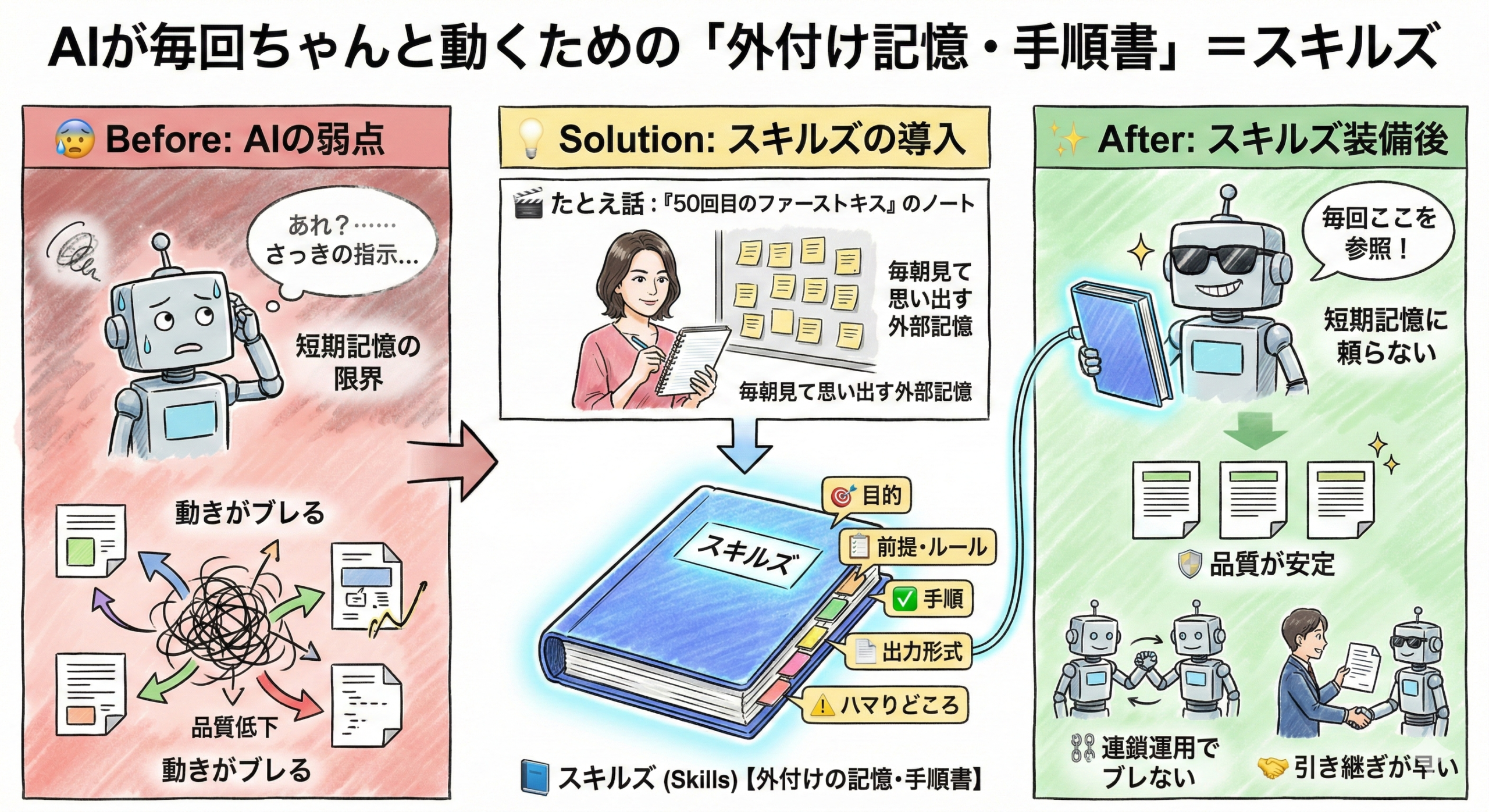スキルズ(Skills)は、「AI(やエージェント)が毎回ちゃんと動けるようにするための外付けの記憶・手順書のこと。