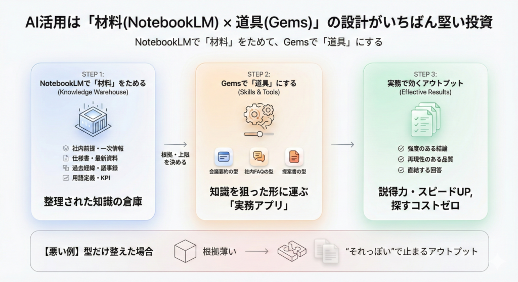 結論:NotebookLMは「根拠の倉庫」、Gemsは「出力の治具」。
