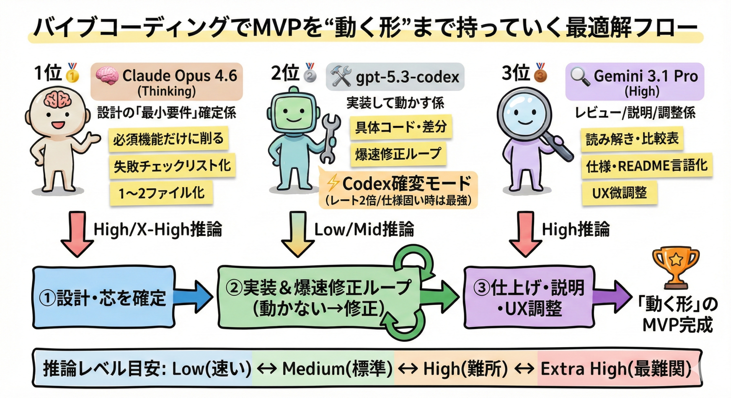- 3位:Gemini 3.1 Pro (High):広い文脈処理や説明は強いが、MVP実装の「手触り」は上2つに一歩譲ることがある