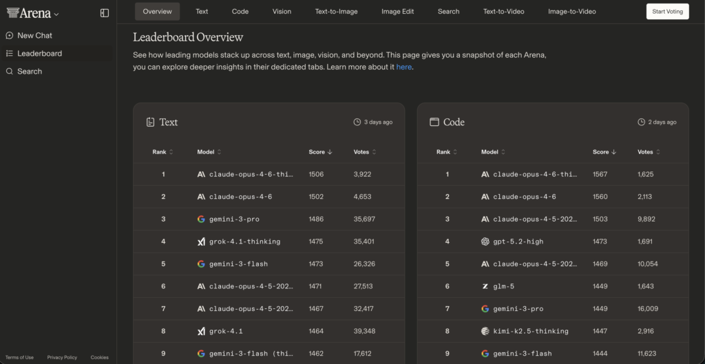 いろんなAIを「実際に使って比べて、どっちが良かったか」をみんなで投票する場所です。サイトの上の方に並んでる項目は、「どんな場面でAIを比べるか」のカテゴリー。