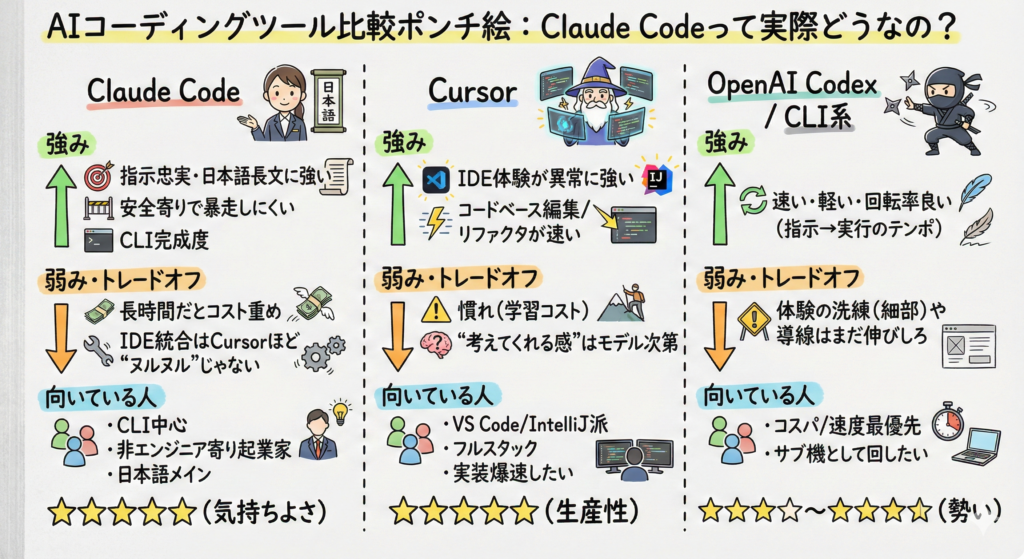 | Claude Code | 指示忠実・日本語長文に強い・安全寄りで暴走しにくい・CLI完成度 | 長時間だとコスト重め/IDE統合はCursorほど“ヌルヌル”じゃない | CLI中心、非エンジニア寄り起業家、日本語メイン | ★★★★★(気持ちよさ) |