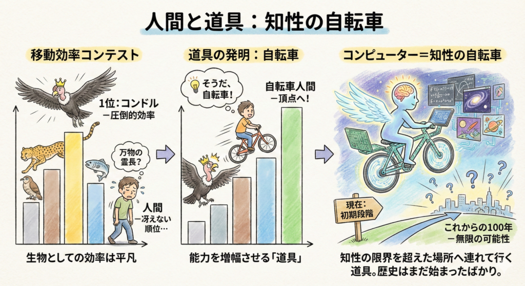 「人間とは道具を作る存在である」ということです。私たちは、自分たちが本来持っている能力を、驚異的な次元にまで増幅させる道具を形作ることができるのです。