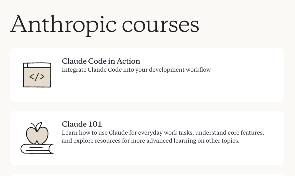 Claudeをより深く理解したい、あるいは業務や開発に本格的に導入したいと考えている方にとって、非常に信頼できる公式の学習リソースです。特にエンジニアの方には、最新のMCP(Model Context Protocol)などの講座が非常に役立つ内容となっています。