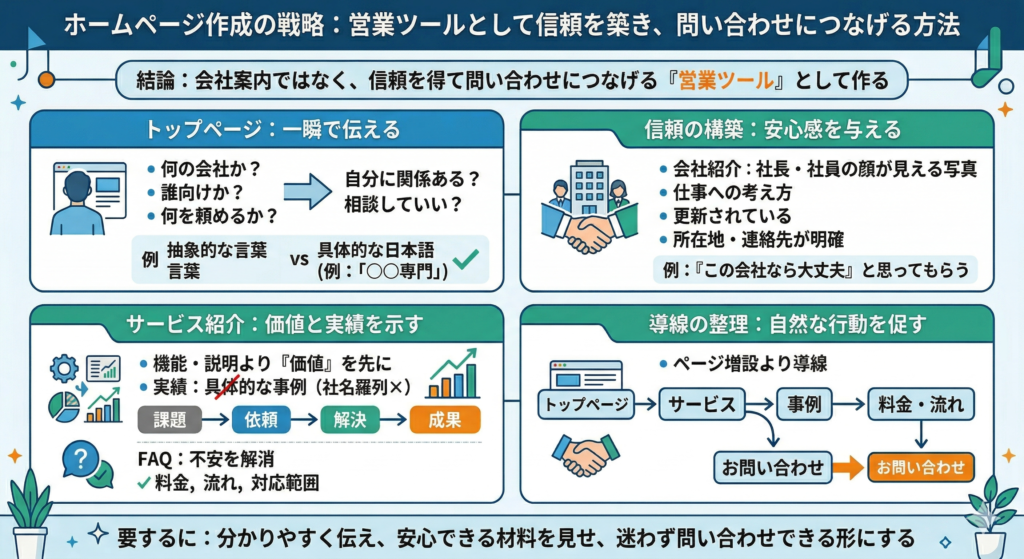 ホームページ作り整理すると、結論ははっきりしています。ホームページは会社案内ではなく、信頼を得て問い合わせにつなげる営業ツールとして作るべき、という考え方です。