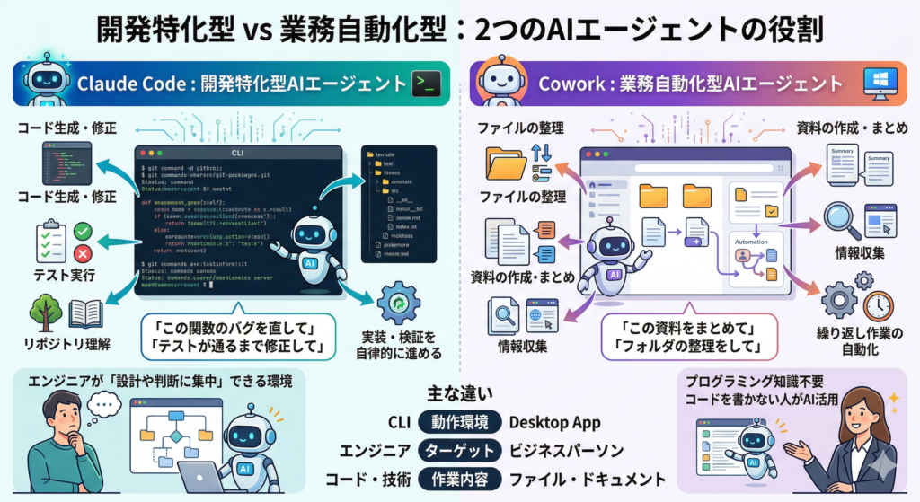 結論から言うと、Claude Codeは開発特化型AIエージェント、Coworkは業務実行型AIエージェントです。