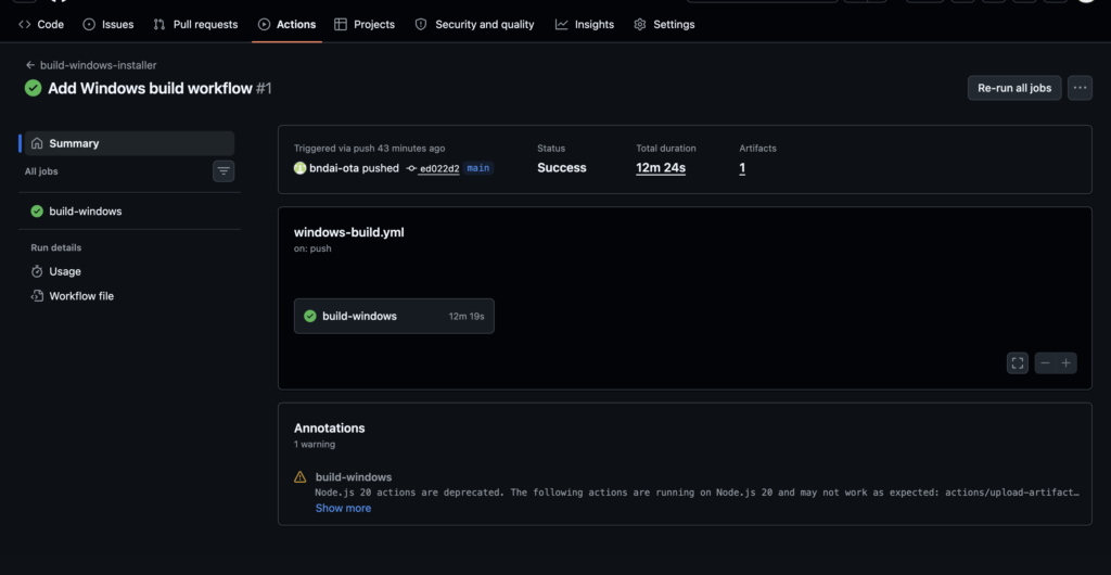 push:の部分をコメントアウトしてworkflow_dispatch:だけ残しておけば、GitHubの画面から「Run workflow」ボタンを押した時だけビルドされるようになり、GitHubの無料枠を節約できます。 - 警告(Warning)が出たら:先ほどのスクショにあったように、Node.jsのバージョンに関する警告が出た場合は、YAML内の