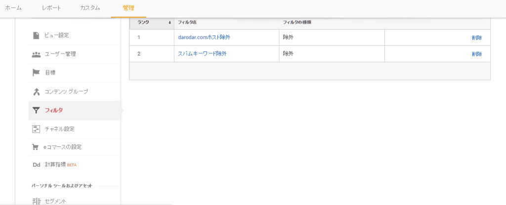 アナリティクス設定>>フィルタに移動し、