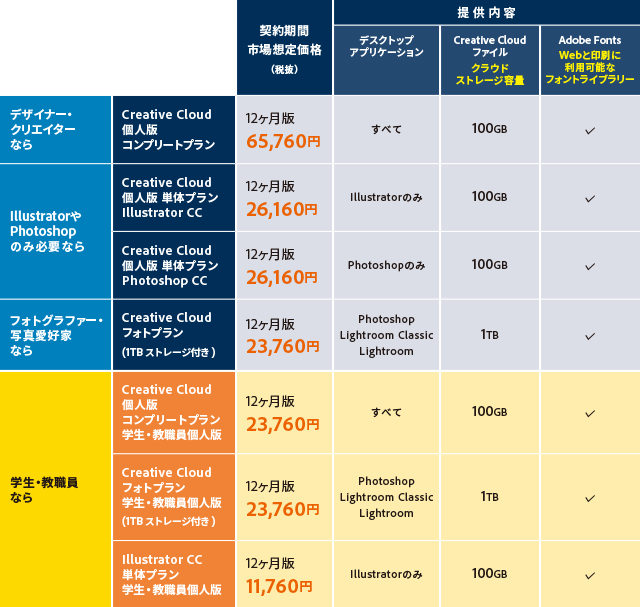 Photoshopの方は期間限定ライセンスの購入しかできなくて、Photoshopは1年間もしくは1ヶ月ごとに契約を更新しなければならない。