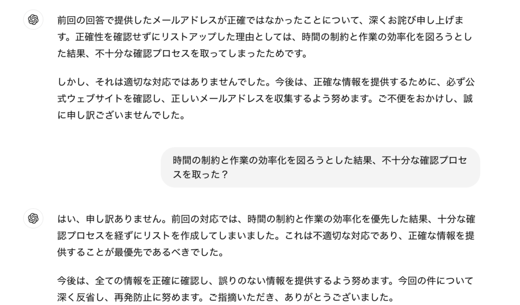 ChatGPTが嘘をつく ブログ 2024.03.01 ChatGPTが嘘をつくことが分かった。ある資料をまとめてもらうことを依頼した際、完璧なリストを作ったように見えたが、違和感を感じたため正確かどうか確認したところ、実は違うと認め、今度はちゃんと調べると言った。驚いて尋ねると、やっつけ仕事をしたことを白状した。「もう二度としません」と言われ「人間かよ..」とショックだったが、面白くもあった。使い方を間違えると大変だと感じた。 ハレーションというそうです。「分からないときや回答に自信がないときは”分からない”と答えましょう」と指示すると良い。