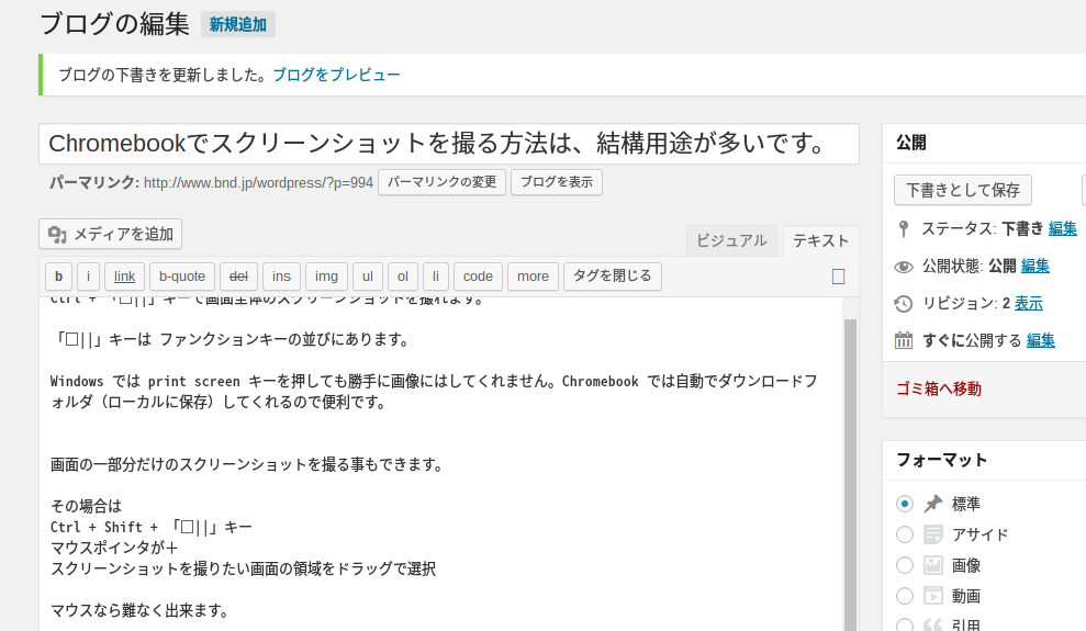 Windows では print screen キーを押しても勝手に画像を保存しませんが、Chromebook では自動でダウンロード(ローカルに保存)してくれるので便利です。